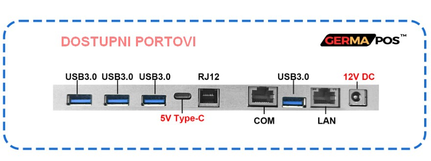- Portovi: LAN, 4x USB, COM, Tip C, RJ12, WiFi – podrška za više perifernih uređaja